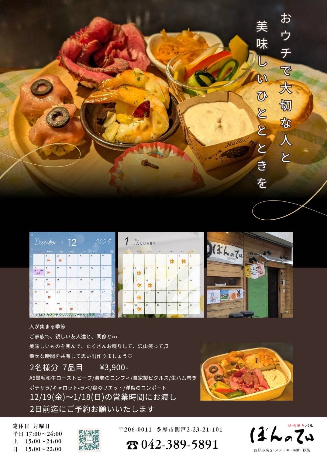 年末年始の特別オードブル ~人が集まる季節~ ご家族で、親しい友人とちと、同僚と… 美味しいものを囲んで、たくさんお喋りして、沢山笑って🎵 幸せな時間を共有して思い出作りしましょう♡ 2名様分 7品目 ¥3,900- A5ランク黒毛和牛ローストビーフ/海老のコンフィ/自家製ピクルス/生ハム巻きポテサラ/キャロット・ラペ/鶏のリエット/洋梨のコンポート 12/19(金)~1/18(日)の営業時間にお渡し 2日前迄にご予約お願いいたします